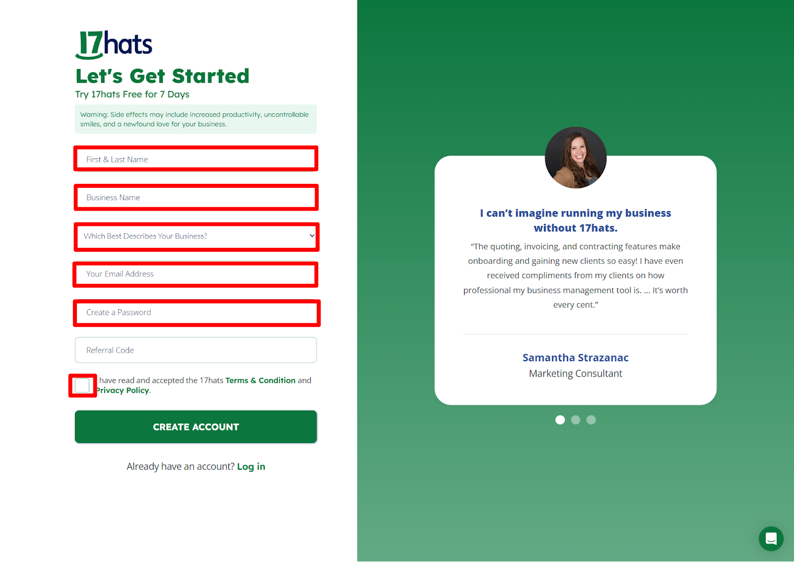 Start by clicking the 7-day trial option on the 17hats signup. You’ll see a short form asking for some basic information.