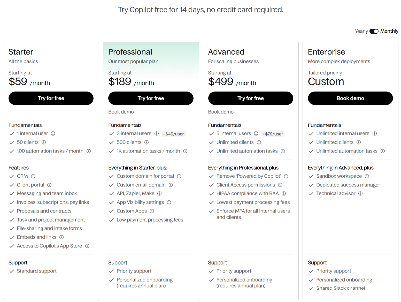 - Copilot: Ideal for brands prioritizing sleek client portals, secure messaging, and embedded e-signatures.
