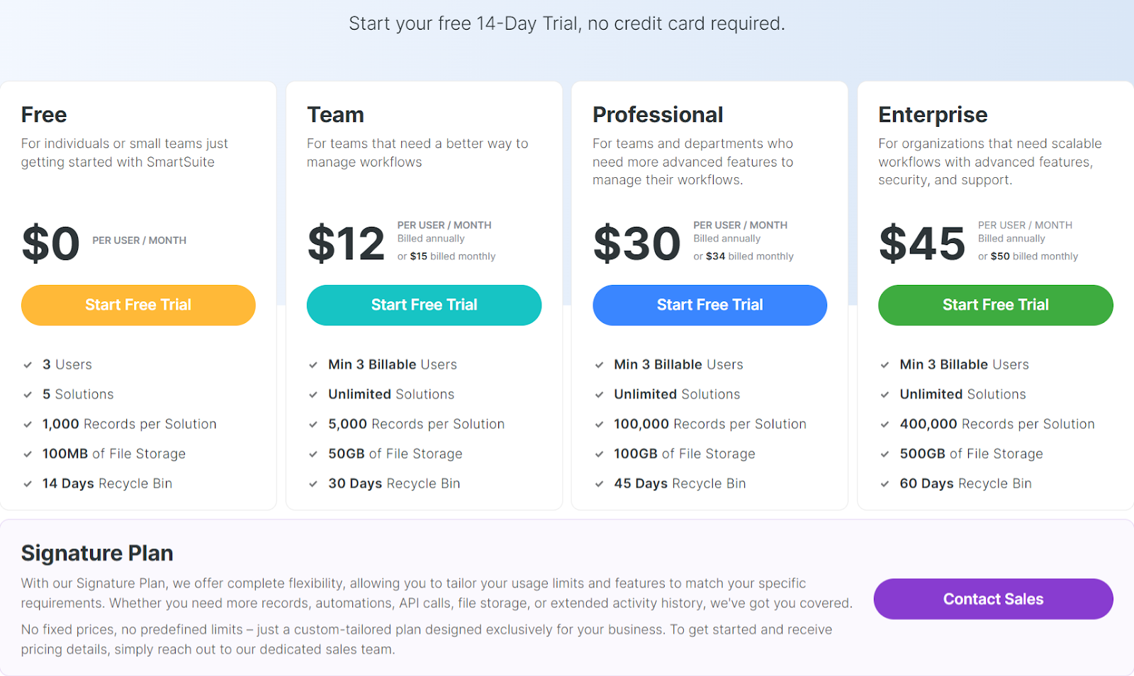 | SmartSuite | Custom CRM pipelines | Gantt charts | 14-day | $15/month |