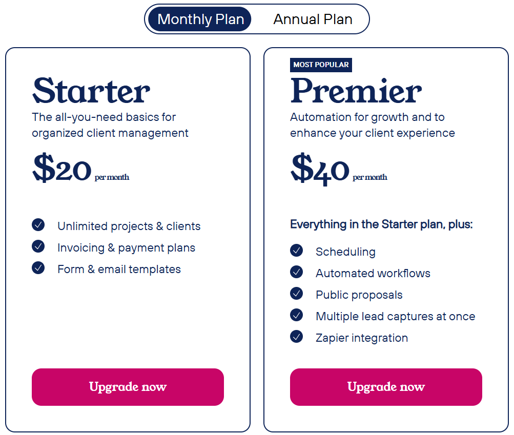 - Dubsado: Ideal for solopreneurs who want polished client workflows, automated contracts, and flexible payment plans.