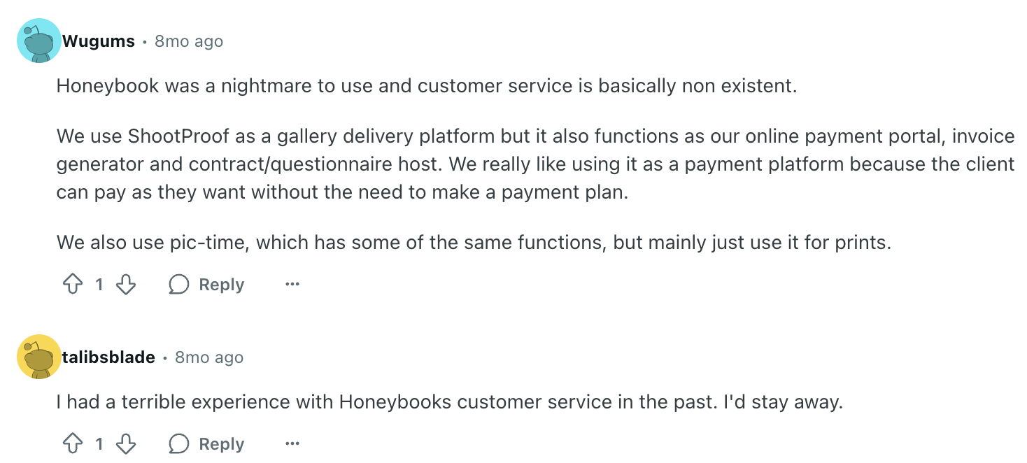 When we used HoneyBook, we were surprised to see that HoneyBook doesn’t come with a ticket support system. That could help you solve issues the client raises.
