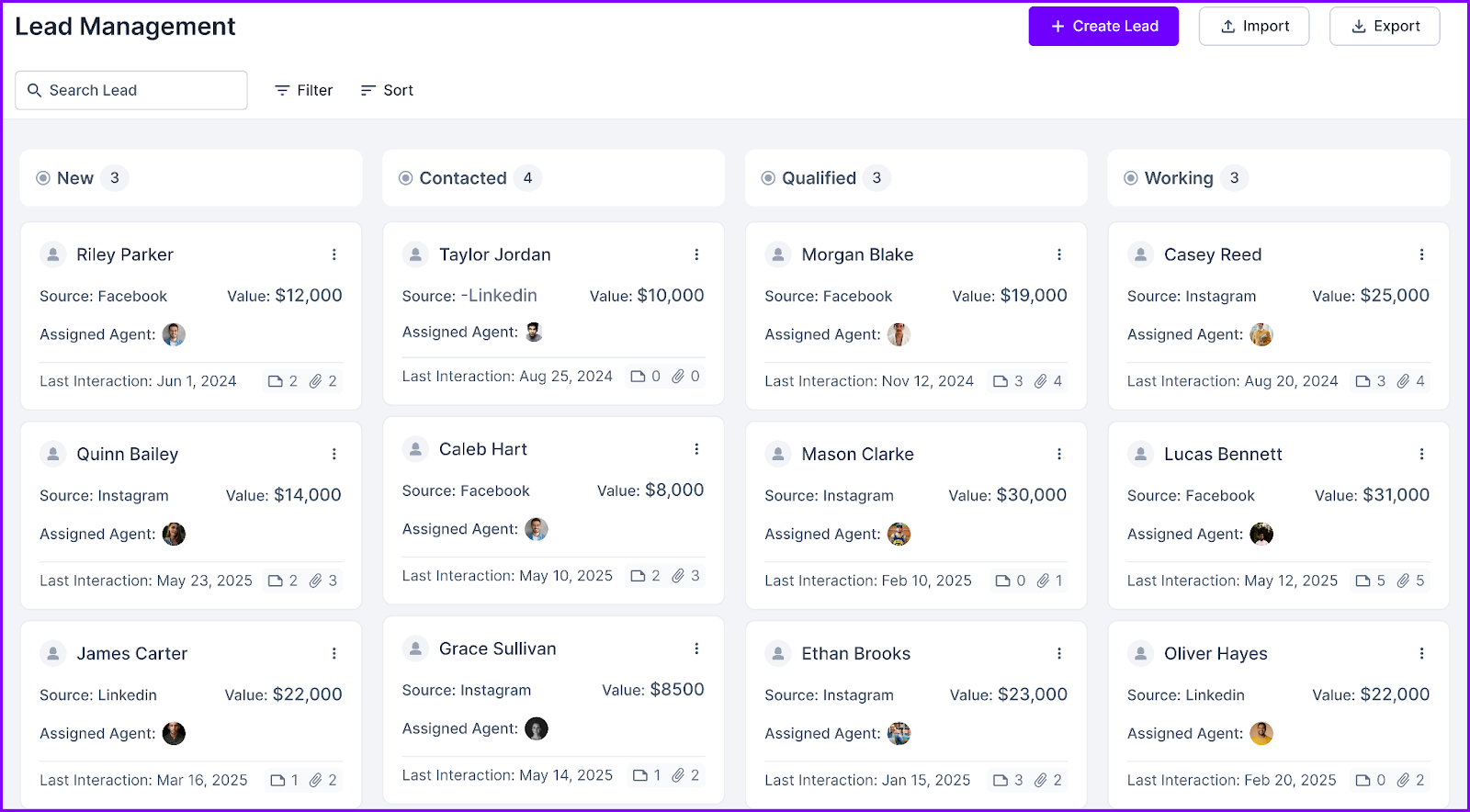 It gives you a ready-to-use CRM from day one. You can add leads manually or upload them with a CSV. Track lead sources, assign team members, and update deal stages with just a few clicks.